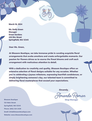 For this class assignment, we came up with unique takes on a fictional flower shop's branding materials. I decided to create a logo for a small-town flower shop I named "Blossom Boutique".